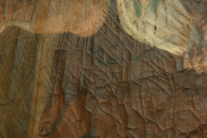 Oljni premaz (temnejši) z ostanki škrobnega lepila (belo). V spodnjem delu že odstranjena.