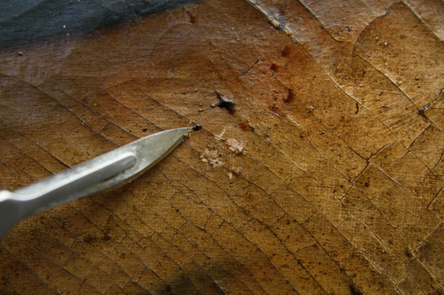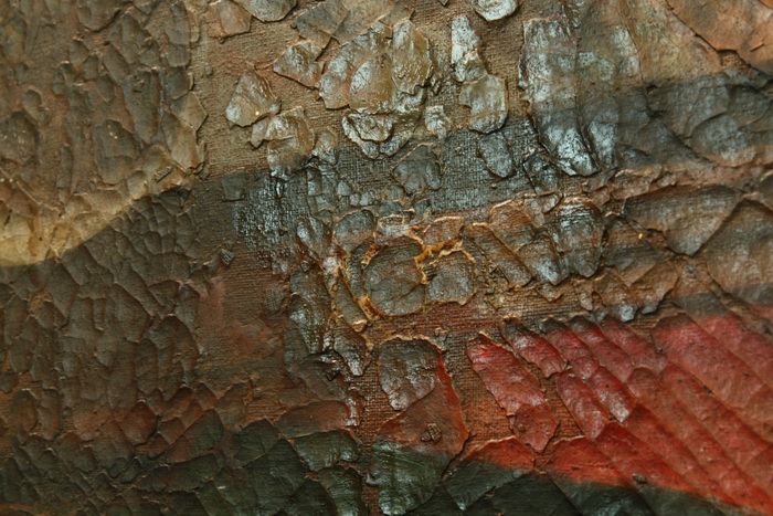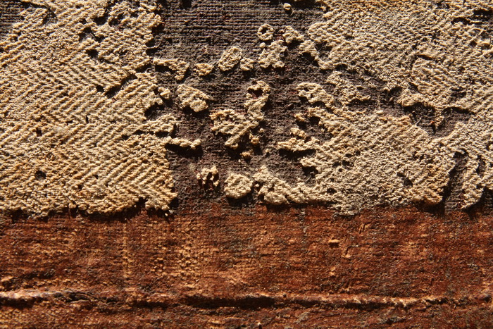 Po odstranjevanju oljnega premaza in škrobnega lepila viden 'odtis' originalnega podokvirja na originalnem platnu.