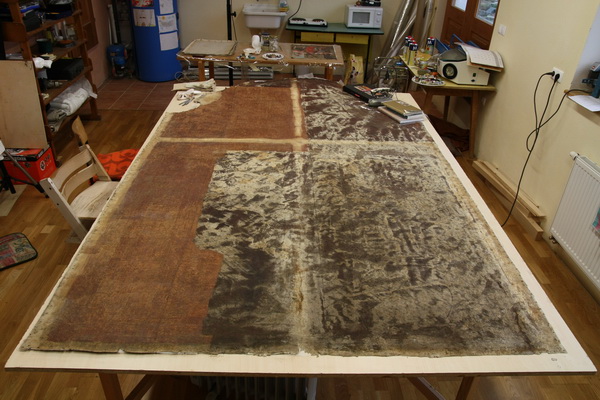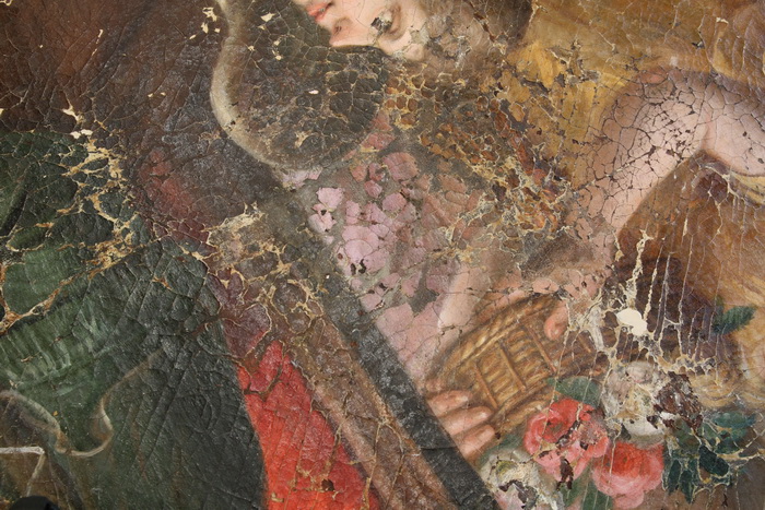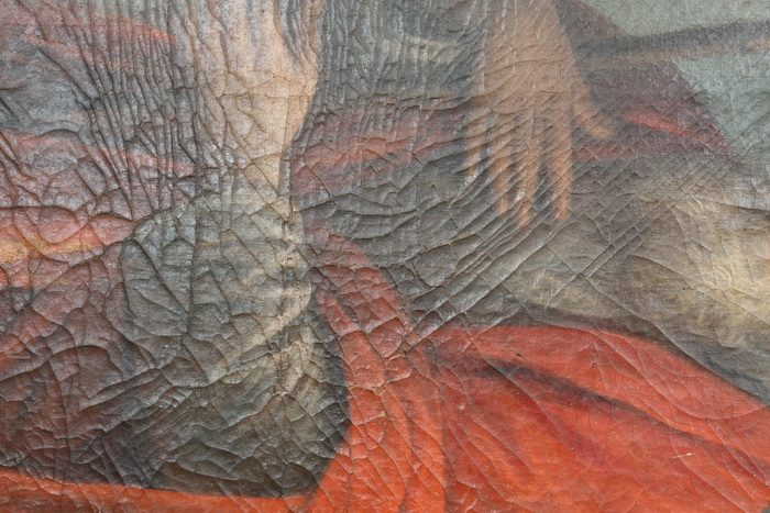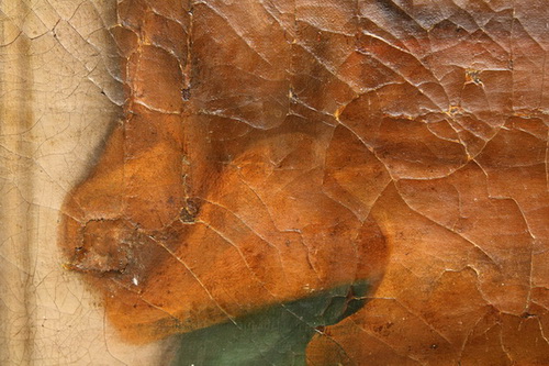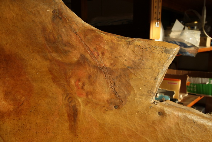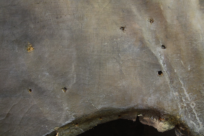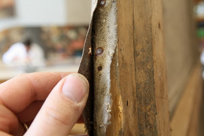Originalno platno je bilo očitno nalepljeno na podlepljeno, ko je bilo to že napeto na podokvirju (luknje žebljev).