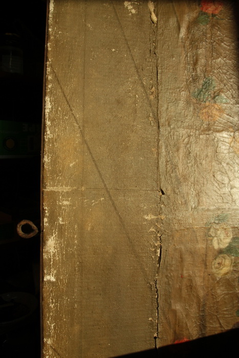 Hrbtna stran slike pred posegom. Vidno podlepljeno platno.
