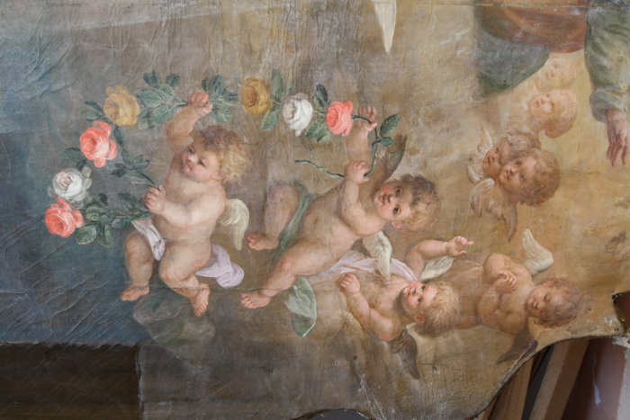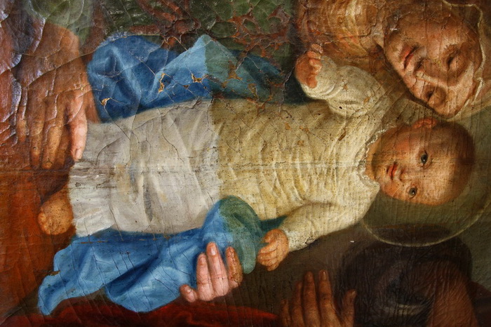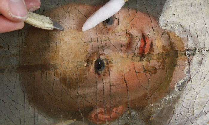 Med preteklimi posegi stabilizirani kosci barvne plasti z grundom. Retuša na mestih odpadlih koscev je bila izvedla neposredno na originalno platno. Hkrati je bila preslikana originalna poslikava na ohranjenih koscih.