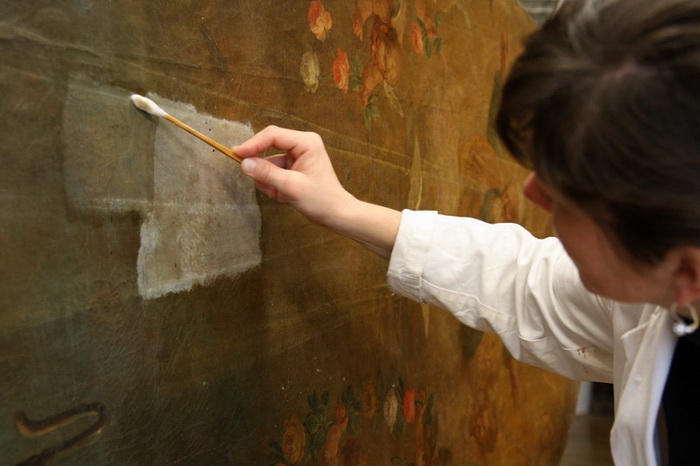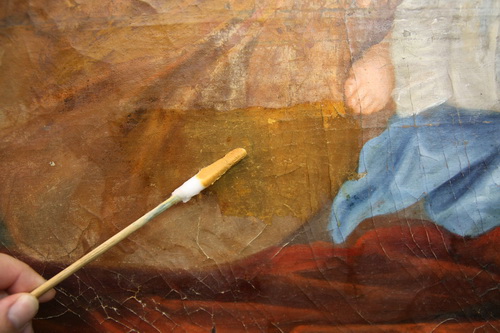 Odstranjevanje porumenelega laka in nečistoč. Zaradi stabilnega stanja barvne plasti in platna se je postopek izvajalo pred snetjem slike s podokvirja, v napetem stanju, pokonci.
