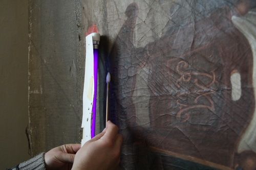 Detajl pred in po (ob prehodu miške) postopku odstranjevanja preslikav. Na sliki je veliko preslikav ki prekrivajo dobro ohranjen original in se odstranjujejo mehansko s skalpelom.