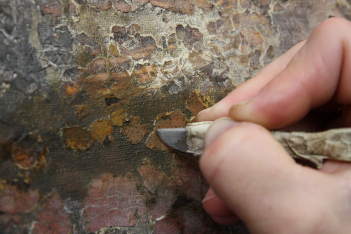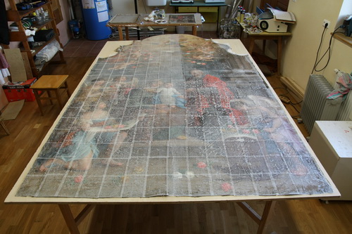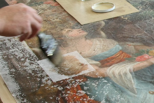 Preventivna zaščita lica slike zaradi nadaljnjih posegov na hrbtni strani originalnega platna.