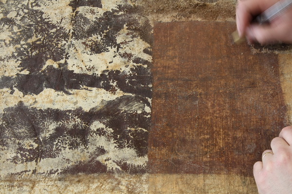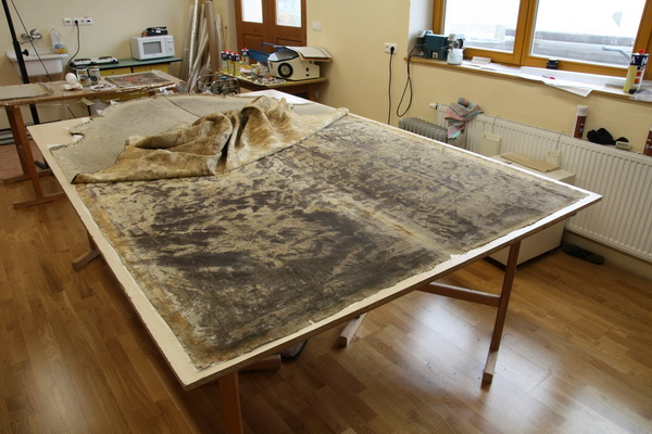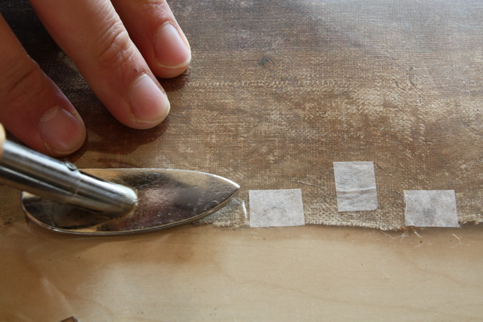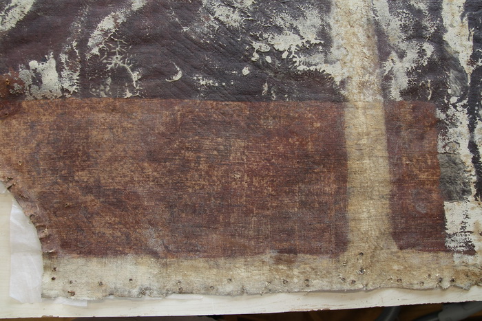 Hrbtna stran originalnega platna med odstranjevanjem oljnega premaza in škrobnega lepila.