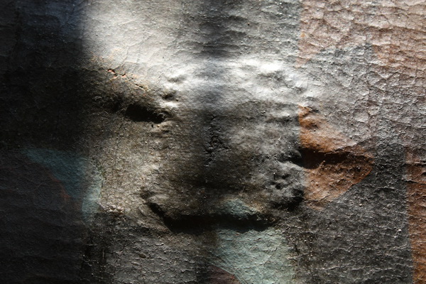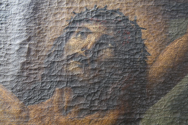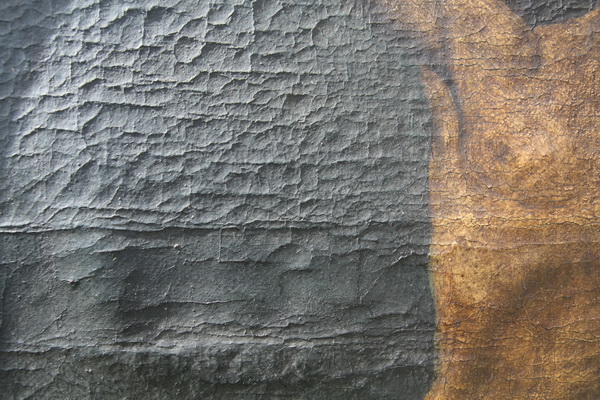 Detajl pred posegom pod stransko osvetlitvijo. Močno banjasto razpokana barvna plast.