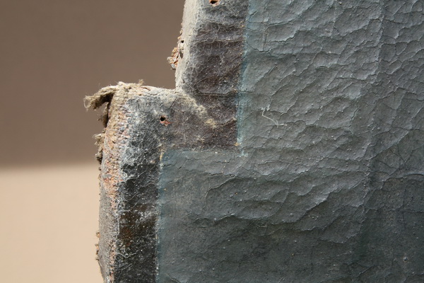 V preteklosti podlepljena poškodba. Spodaj hrbtna, zgoraj prednja stran. Vidna močna deformacija površine slike.