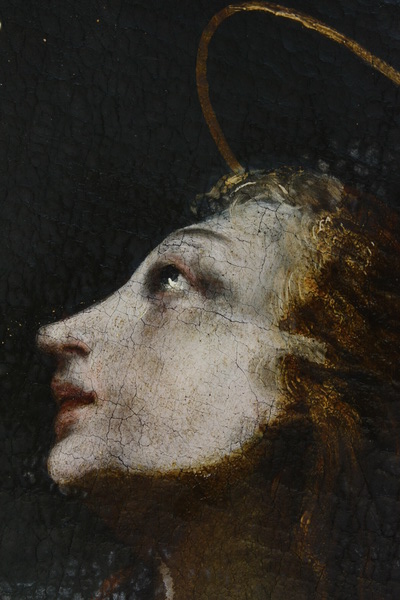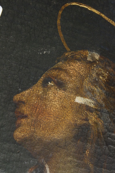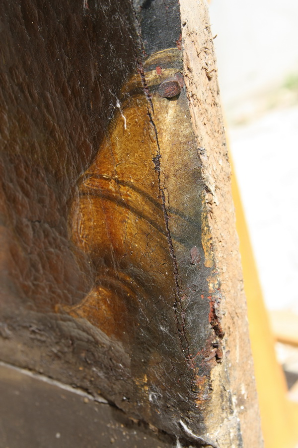 Gornji rob slike pred posegi, po odstranjenem lesenem okrasnem okvirju, ki je bil pribit s prednje strani na sliko. Vidna preslikava, ki je segala le do pribitega lesenega okvirja, kar pomeni, da je bila slika preslikana, ko je bil nanjo pribit okvir. Vidni tudi ostanki pozlate, s katero je bil pozlačen okvir.