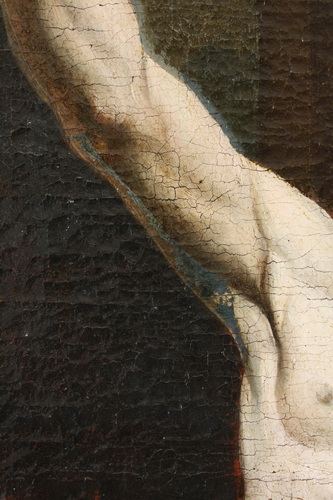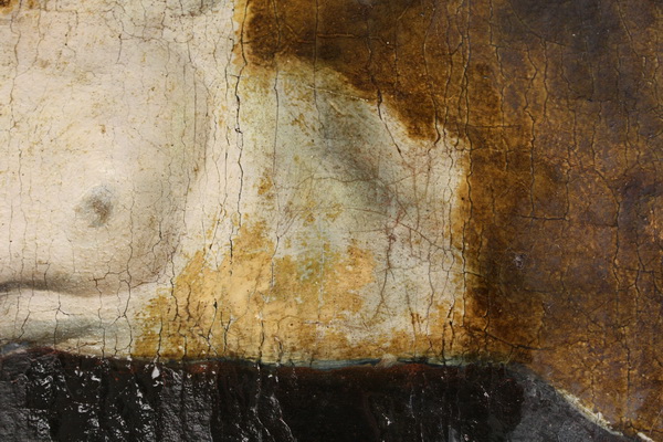 Detajl pred posegom pod stransko osvetlitvijo. Močno banjasto razpokana barvna plast. Viden 'odtis' prečne prečke podokvira (spodnja polovica).