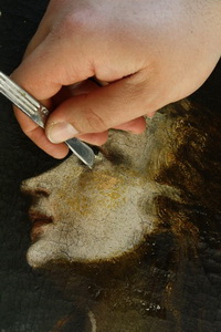Odstranjevanje nečistoč, lakov in preslikav je potekalo fazno. Najprej grobo odstranjevanje lakov, nečistoč in patin (levo). Nato odstranjevanje morebitnih pastoznih preslikav s skalpelom (sredi). Nato finalno odstranjevanje ostankov (desno).