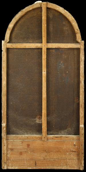Hrbtišče in lice slike pred posegom. Na spodnji del podokvirja je bila nameščena lesena deska, ker je slika na platnu premajhna za oltarno odprtino. To nakazuje na to, da slika prvotno verjetno ni bila naslikana za oltar v cerkvi. Na to kaže tudi obdelava platna na vrhu slike, kjer se da razbrati, da je bila slika prvotno zgoraj ravna in ne polkrožno zaključena.