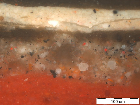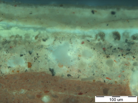 Mikroskopski posnetek barvnega vzorca vzetega na preslikanem nebu. Zgorja pri vidni svetlobi, spodaj pri ultravijolični svetlobi. (foto in interpretacija: Ivo Nemec, Restavratorski center) Od spodaj novzgor si sledijo plasti: 1- rdeča podloga, 2- svetlo sivo rjava, dva sloja, 3- lak, sledi mikroorganizmov, 4- lak, 5- svetla sivkasto koščena, 6- svetla koščena, 7- lak, patina. Sloj 2 je originalna poslikava (svetlo rjavo nebo), sloja 5 in 6 sta preslikava (svetlo modro nebo, koščeni oblaki).