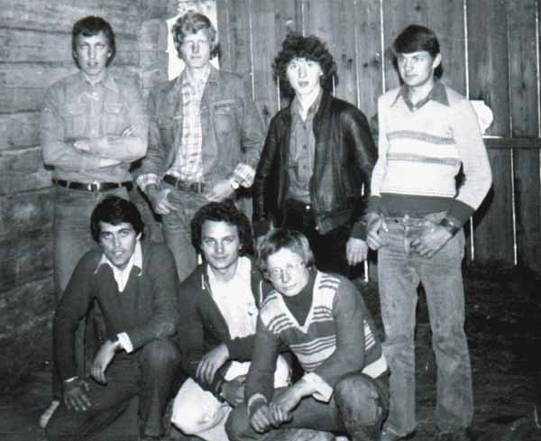 Foto 1: Skupina topolških jamarjev iz leta 1980. Z leve proti desni stojijo: Slavko Hostnik, Mirko Močnik, Branko Lukanc in