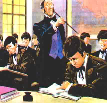 Andersen je ostal popolnoma sam in brez denarja. Potikal se je po ulicah, bil je hudo lačen. Na srečo se ga je Jonas Collin iz uprave kraljevega gledališča le usmilil in mu omogočil šolanje. Toda Hans je bil slab in len učenec in tako se je zanj začelo pet najmračnejših in žalostnih let v življenju. Zaradi čudaškega vedenja se mu je smejal ves razred, učitelji pa so se nanj jezili, ker se je slabo učil in po njihovem mnenju samo zapravljal čas s pisanjem pesmi. Prav nič niso skrivali pred njim očitnega nezadovoljstva. |