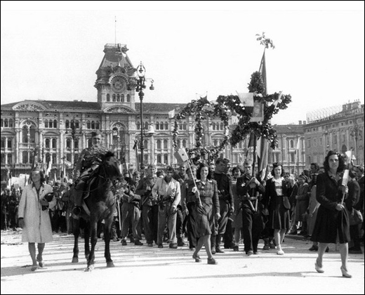Jugoslovanska armada je s slovenskimi brigadami in tržaškimi protifašisti zasedla Trst maja 1945, s tem so uresničili medvojne sklepe o priključitvi Primorske k Sloveniji. Slovenci v Primorju, Istri in Trstu, so jugoslovanske partizane pozdravili kot osvoboditelje in so pričakovali priključitev Primorske k Jugoslaviji, pridružili so se jim tudi italijanski delavci, za katere je bila Jugoslavija obljubljena komunistična dežela. Med večino Italijanov pa se je širil strah pred slovansko in komunistično nevarnostjo. Jugoslovanska armada aretirala in ubila več ljudi, ki so bili pripadniki fašistov, ali pa niso bili naklonjeni jugoslovanski oblasti. Usmrčene so pometali v kraške jame, fojbe v istrskem italijanskem narečju. Ocene navajajo da naj bi bilo okoli 1.600 žrtev. |