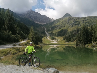 kolesarim po makadamu po dolini potoka Dorfenbach do jezera Klapfsee (nv 1680m).