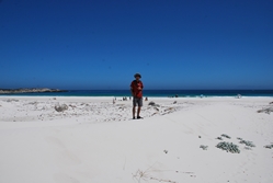 klifi. Peljeva se mimo dolge, bele plaže s kajtarji,