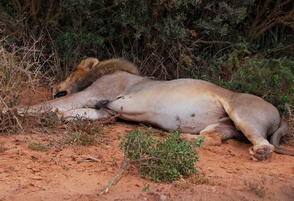 Ustaviva se in ob napajališču sta lev in levinja. Pijeta, nato ležeta na sonce.