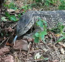 varana, ki se suka pod drevesom in je plodove. Na drevesu zagledava še enega,