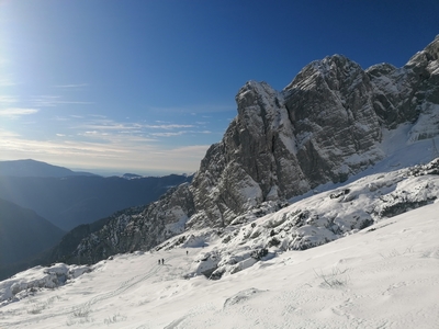 planine Krnica. Sneg je pomrznjen, zato si že kmalu nataknemo srenače. Vzpenjamo