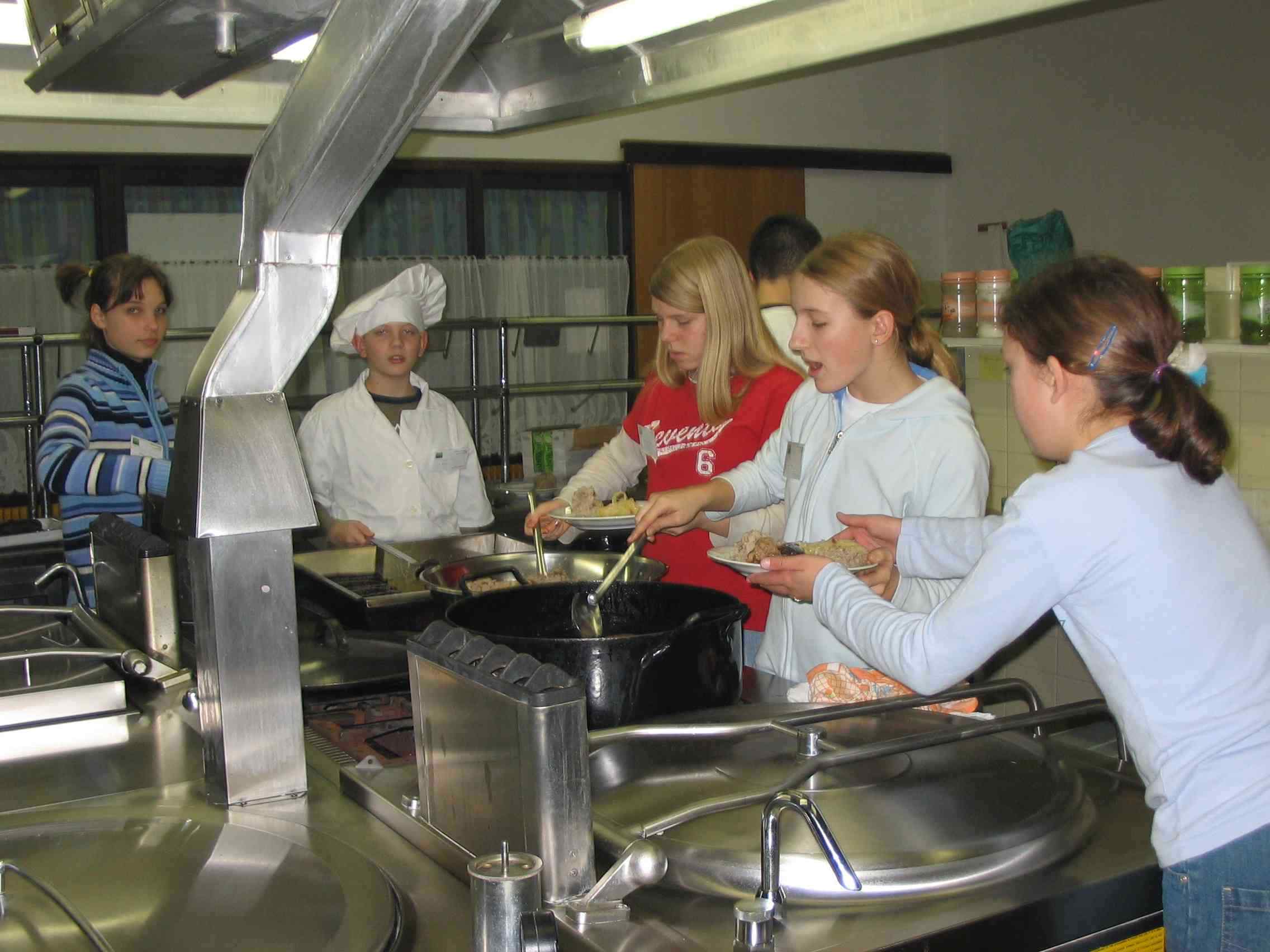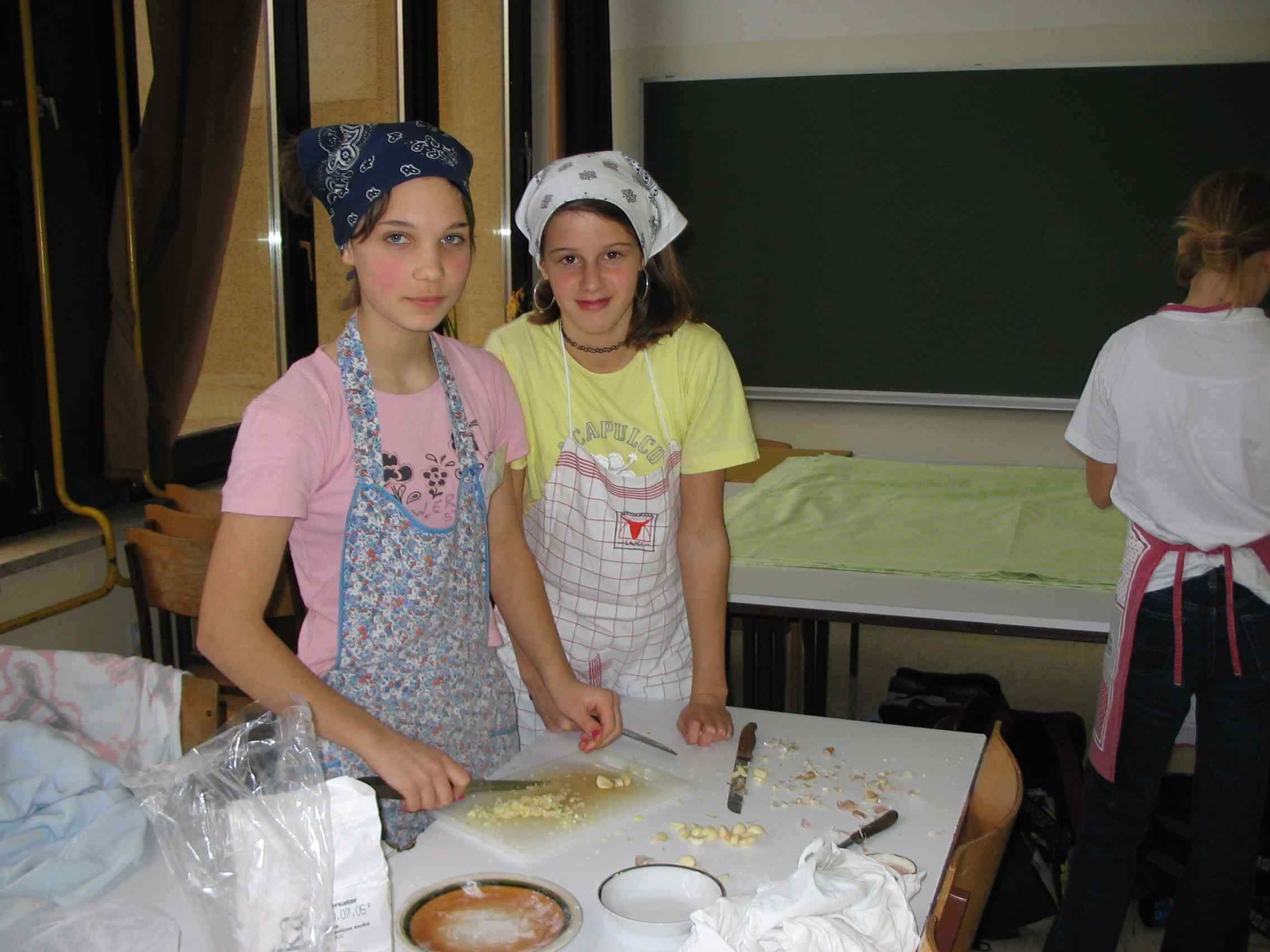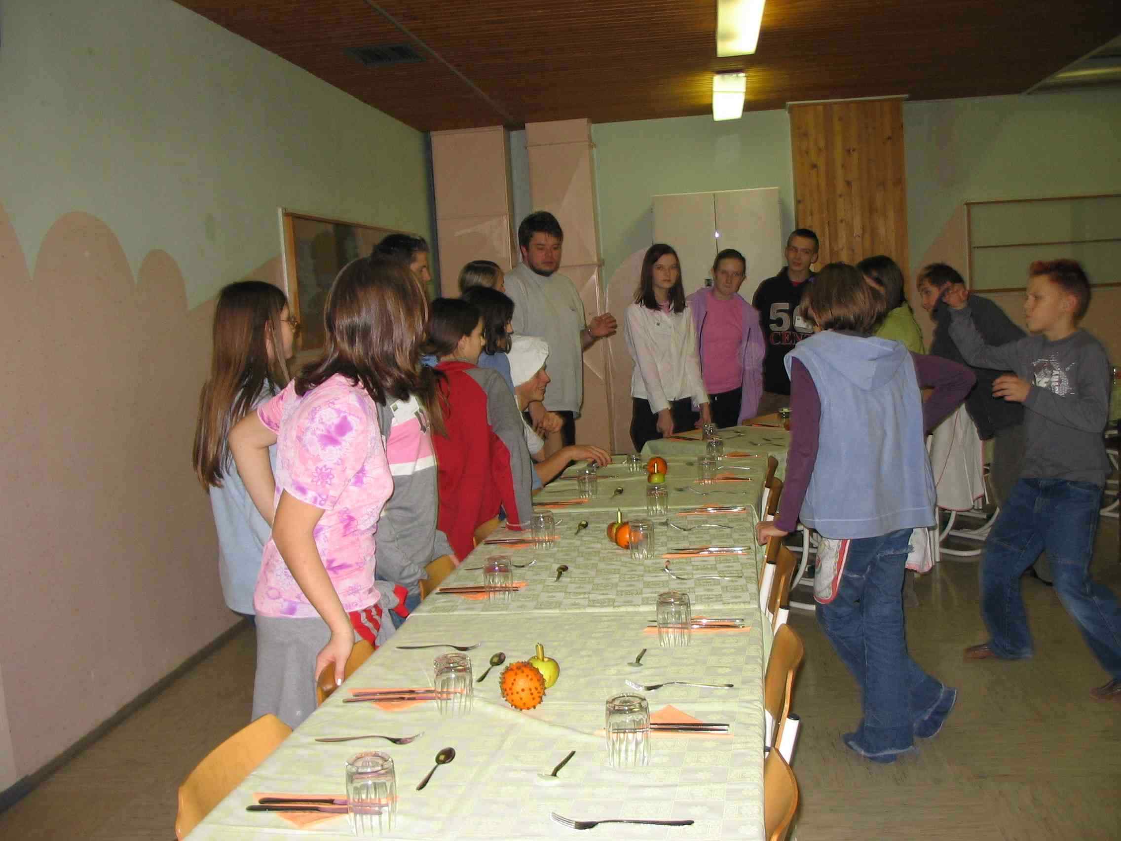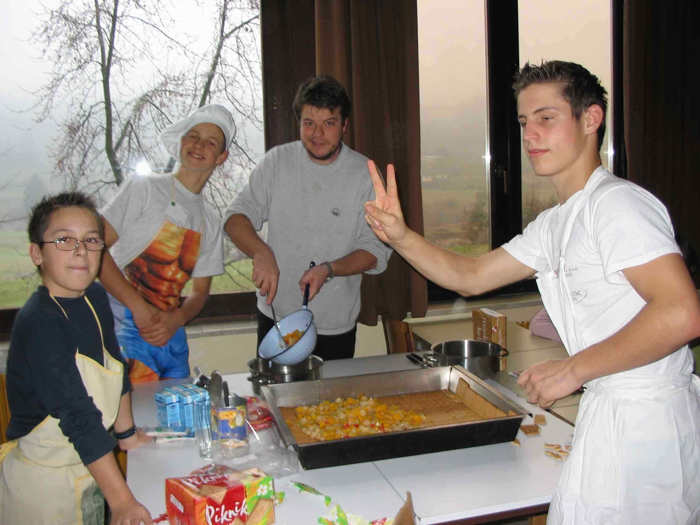 Na tej strani je predstavljenih nekaj slik, ki so nastale pri pripravi in izvedbi večerje za naše starše v mesecu decembru 2004. Večerja je bila zelo uspešna, saj so vsi starši pohvalili pripravo jedi, postrežbo ter sprejem. Vse to so pripravili učenci sami, kuhali so v šolski kuhinji skupaj z učenci, ki so obiskovali izbirni predmet Sodobna priprava hrane pod vodstvom ge. Maje Zidar. Pri pripravi žgancev nam je bila v veliko pomoč tudi ga. Marija Bezek. |