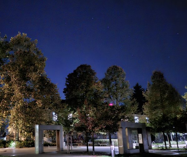 Lega asterizma Veliki voz nad parkom ob Zupančičevi jami. Med drevesi spodaj se zazna dvojna zvezda Karlovo srce (Cor Caroli).