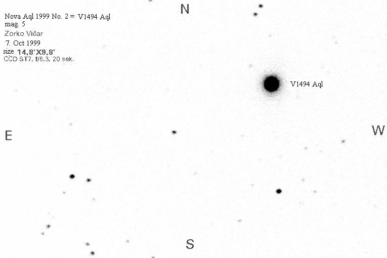 Posnetek nove Orla (Nova Aql 1999 No. 2=V1494 Aql) s CCD kamero ST7 v gorišču teleskopa MEADE LX200, D=25,4 cm, f/6,3, čas osvetlitve 20 sekund. Datum: 7. december 1999, ob 19. uri. Posnel Zorko Vičar. Karte so na stani: http://www.aavso.org/alert264.stm