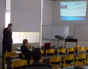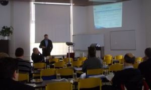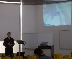 Predavanja so potekala v veliki predavalnici Instituta za metalne konstrukcije. Na sliki predavatelj dr. Robert Cvelbar med uvodnimi predavanji.
