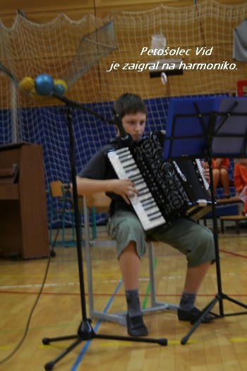 Danes smo imeli prireditev ob zaključku bralne značke. Otroci smo si ogledali kulturno prireditev in obiskali knjižni sejem. Na sejmu smo kupovali in prodajali knjige. Nekateri smo si knjige samo ogledovali. Pevski zbor je na nastopu zapel nekaj pesmic. Deklice iz našega razreda so plesale. Sošolec Jure je igral na violino, Jaka pa na harmoniko. Po prireditvi smo imeli še malo pouka. Aljaž Pezdirc 4.b |