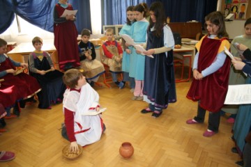 V četrtek, 24. januarja 2008, smo imeli učne delavnice o Rimljanih. Iz Mestnega muzeja Ljubljana sta na našo šolo prišli kustosinji. Pokazali sta nam slike – tloris Emone, načrt Emone itd. Povedali sta razne zanimivosti o Rimljanih, za nekatere izmed njih smo že slišali. Pripravili sta nam razstavo predmetov, ki so jih uporabljali Rimljani. Prinesli sta jih v 'kovčku'. Ti primerki seveda niso bili pravi, ampak kopije – ponaredki. Najbolj zanimiva je bila voščena tablica, na katero so pisali otroci. Tudi mi smo nekaj napisali nanjo. Na koncu smo zaigrali igrico Marcus je dopolnil 16. let. Za Rimljane je bilo značilno, da so pri 16. postali polnoletni. Kustosinji sta izbrali deset učencev in jih oblekli v toge, ogrinjala in razne plašče. Odigrali smo kratko igro, naša učiteljica pa je vneto slikala. Bilo je zelo zabavno in zanimivo. Svit Komel, 5.a