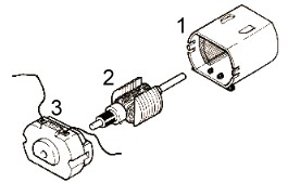 1. Magneta 2. Tuljava, navita na kotvi -rotor 3. Komutator (spreminja smer toka in s tem vzdržuje gibanje tuljave) |
