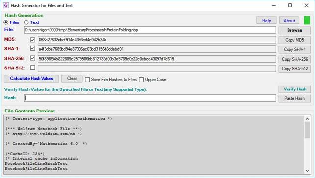 After file hash values are calculated, they can be saved to a file by checking the ”Save File Hashes to Files” checkbox. Hashes are saved to the file with the same name as the verified file, but with the “.chk” extension added. Hashes are saved to a text file whose contents can always be retrieved later. File contents look like this: