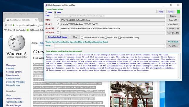 Text can be pasted into the text box from clipboard, therefore it can be copy-paste from any application that supports selection and copying of text (such as browsers, office applications, word processors, text editors, etc.). In order to copy-paste the text whose hash values are calculated, the application must be in the text mode. If in the file mode, user must first click the “Text” radio button to switch to text mode.