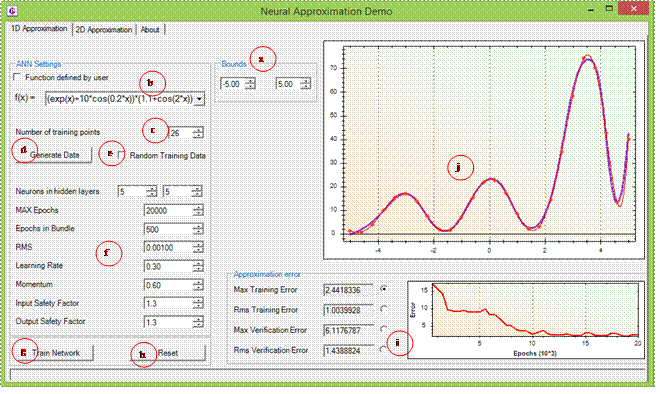 User interface is intuitive and you can start using the program without reading this manual and without prior knowledge about artificial neural networks. Initial values of various parameters are chosen in such a way that meaningful results should be obtained by these initial values. After some clicks on action buttons, when you figure out how the software works, you can change training parameters to see how approximations can be improved with optimal settings, try which is the minimum quantity of data (number of sampling points) necessary to obtain a meaningful approximation, experiment with more complex model functions and explore graphically which are the details that are more difficult to approximate.