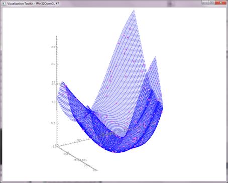 User interaction capabilities can be used to precisely position the view in order to make interesting details appear more obvious, but also for achieving some special effect. Figure 5 demonstrates, for example, how actor mode (switched on by pressing the a key and switched off by pressing the c key to go back to camera mode) can be used to move the graph of the approximation apart from the graphs of the approximated function and sampled values used for training. This has been done in the following way. First the trackball mode was switched on by pressing t. Then the graph was rotated (left mouse button, with holding the Ctrl key for rotation in the projection plane), translated (Shift + left mouse button) and zoomed (right mouse button or mouse wheel) in order to achieve the appropriate view. Then, the actor mode was switched on by pressing the a key, and the approximation (the colored surface) was moved away from the original location to the right by pressing and holding the Shift key and pressing the left mouse button and moving the mouse to the right. Finally, the c key was pressed in order to get back to the camera mode and finely tune the whole graph by translation of the camera. Since objects were not zoomed while in the actor mode and since rotations were not performed since entering the actor mode, one can see the realistic ratios between the original function (blue wireframe) and its approximation (colored surface) and it is obvious that the approximation has lesser total span than the original.