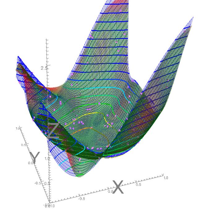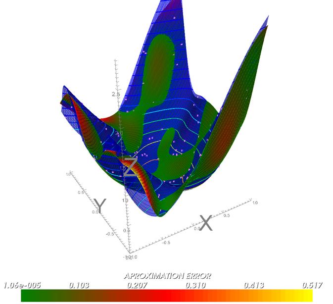 Everything is rather similar than in 1D approximation, and some differences are outlined below. Also the number of sampled values is defined by two values instead of one. If you clear the “Random Training Data” checkbox then values are sampled on a regular grid of points, where the text field beside “Samples on X axis” defines number of points on the grid in x direction, and “Samples on Y axis” defines number of points on the grid in the perpendicular (y) direction. If the “Random Training Data” checkbox is checked then sampling points are generated randomly (with uniform distribution) and the two directions are not distinguished what concerns the generated points. The total number of the generated sampling points equals to the product of both numbers, but their order is interchangeable.
