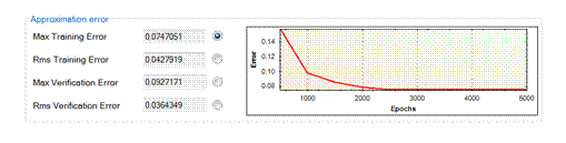 On the graph below, inside the “Approximation error” box, the course of different error measures during the training procedure can be shown, plotted against the number of epochs. By clicking on the appropriate radio button you can choose which error measure is shown on the graph, while final values for all error measures are written in the appropriate boxes.