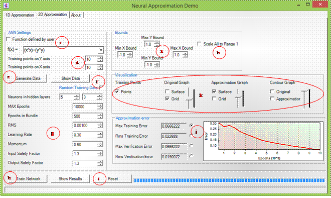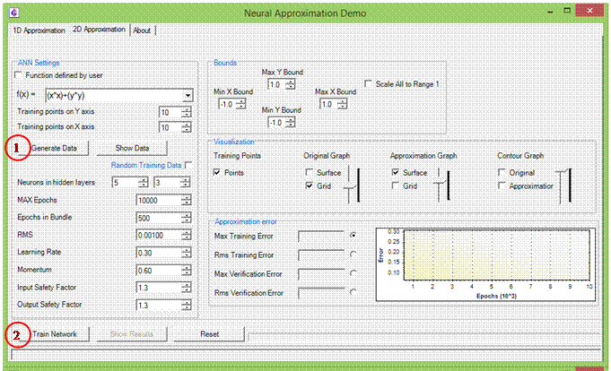 Exploring 2D approximations is just as simple as exploring 2D approximations. You can start without any special knowledge, just click on the “2D Approximation” tab in order to display the appropriate panel (Figure 3), and then the “Generate Data” and then the “Start” button. Before clicking on the “Start” button, you should wait until the graphic window showing the approximated function and sampled data is displayed, and close the window. Graphs are shown in a separate windows in order to allow better quality and interaction with 3D graphs.