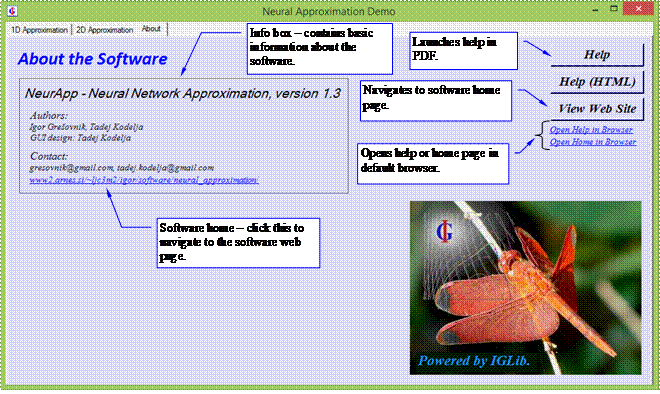 Motivation for development of the software came partially from authors’ personal needs, since authors wanted to gain better insight in features and function of the ANN-based approximations, gained from practical experience and on fast and intuitive way. Therefore they devised a software where one can conceive arbitrary functions of one and two variables, input these functions through a graphical user interface and set them as the reference functions for ANN-based models, sample function values on a regular grid or in randomly distributed values, train the neural network to obtain an approximate model, and inspect properties of the obtained model by observing various statistics and by visual comparison of the model and the original reference function. In this way, it is easy to develop an intuitive feeling for the capabilities and limitations of the ANN-based modeling.