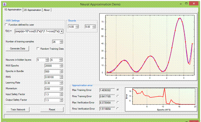 User interface is intuitive and you can start using the program without reading this manual and without prior knowledge about artificial neural networks. Initial values of various parameters are chosen in such a way that meaningful results should be obtained by these initial values. After some clicks on action buttons, when you figure out how the software works, you can change training parameters to see how approximations can be improved with optimal settings, try which is the minimum quantity of data (number of sampling points) necessary to obtain a meaningful approximation, experiment with more complex model functions and explore graphically which are the details that are more difficult to approximate.