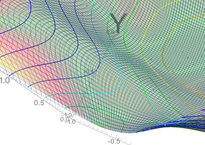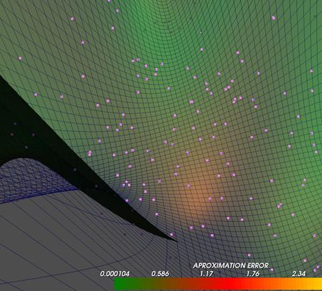 User interaction capabilities can be used to precisely position the view in order to make interesting details appear more obvious, but also for achieving some special effect. Figure 5 demonstrates, for example, how actor mode (switched on by pressing the a key and switched off by pressing the c key to go back to camera mode) can be used to move the graph of the approximation apart from the graphs of the approximated function and sampled values used for training. This has been done in the following way. First the trackball mode was switched on by pressing t. Then the graph was rotated (left mouse button, with holding the Ctrl key for rotation in the projection plane), translated (Shift + left mouse button) and zoomed (right mouse button or mouse wheel) in order to achieve the appropriate view. Then, the actor mode was switched on by pressing the a key, and the approximation (the colored surface) was moved away from the original location to the right by pressing and holding the Shift key and pressing the left mouse button and moving the mouse to the right. Finally, the c key was pressed in order to get back to the camera mode and finely tune the whole graph by translation of the camera. Since objects were not zoomed while in the actor mode and since rotations were not performed since entering the actor mode, one can see the realistic ratios between the original function (blue wireframe) and its approximation (colored surface) and it is obvious that the approximation has lesser total span than the original.