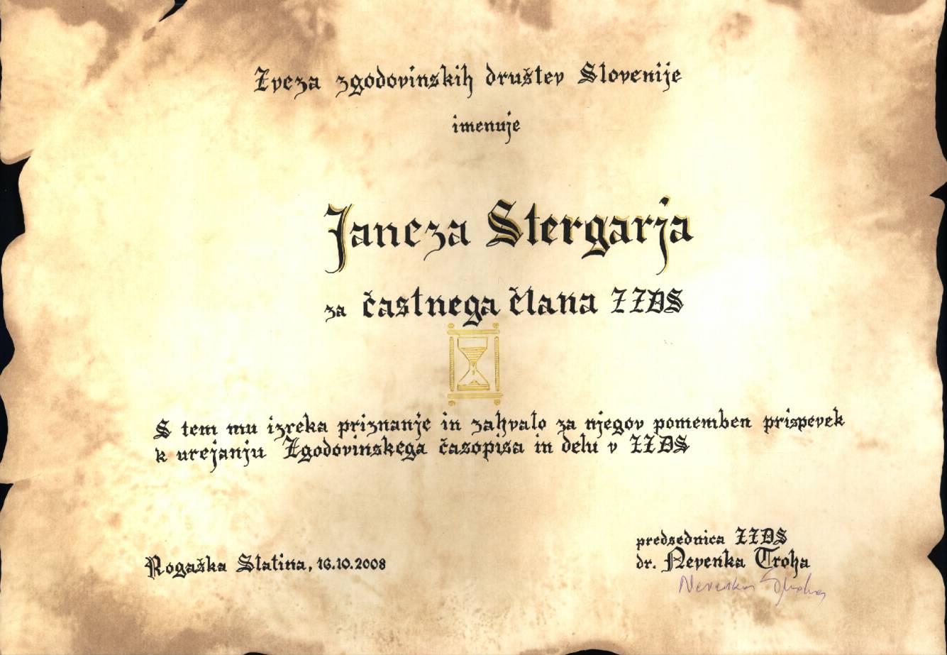 16. oktobra 2008 je Zveza zgodovinskih društev Slovenije na 34. zborovanju slovenskih zgodovinarjev v Rogaški Slatini sodelavca Inštituta za narodnostna vprašanja Janeza Stergarja proglasila za častnega člana ZZDS in mu s tem izrekla priznanje in zahvalo za njegov pomemben prispevek k urejanju Zgodovinskega časopisa in k delu v zvezi.
