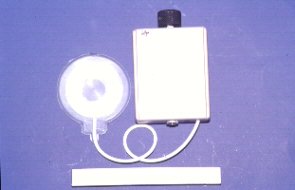 External unit of the single channel system for correction of drop foot in hemiplegic patients with transmitting antenna at the left side of the picture.
