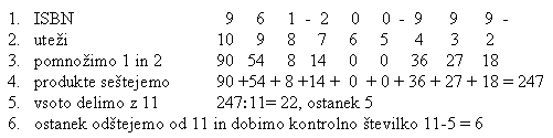 To pomeni, da vsako od prvih devetih številk ISBN - brez kontrolne številke - pomnožimo po vrsti s števili od 10 do 2. Vsota tako dobljenih produktov in kontrolne številke mora biti deljiva z 11, brez ostanka.