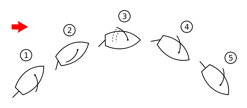 kot je mogoče.![]() Slika 4: cik-cakanje v veter 2. Bočno jadranje (ang. beam reach) To je jadranje od vetra, pri katerem je jadro zategnjeno⁄spuščeno do polovice (jadro jepod kotom 45 stopinj glede na barko). Pri bočnem jadranju je jadrnica pod pravim kotom glede na veter in se premika stran od vetra. 3. Jadranje v krmo (ang. running) To