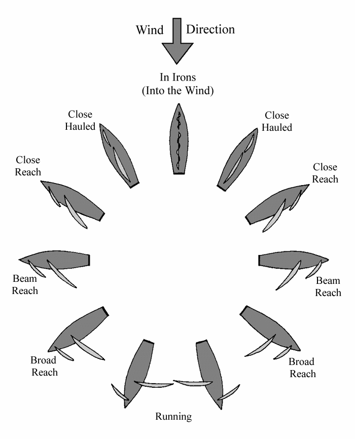 KAKO JADRATI Jadranje je v teoriji zelo preprosto. Vse je odvisno le od zategovanja in popuščanja jadra. Pozicija jadra je odvisna od smeri vetra oz. od želene smeri glede na veter. Glede na smer vetra poznamo tri osnovne oblike jadranja oz. smeri vožnje in dve vmesni obliki. 1. Orca (ang. close hauled) To