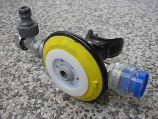 Diving regulator model B-518 developped from a household gas regulator. See article in the magazine