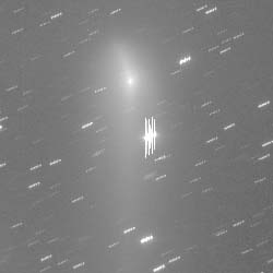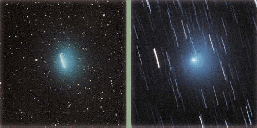 Levo: Komet 1P/Halley je najbolj znan predstavnik skupine kratkoperiodičnih kometov. Spada v Neptunovo skupino, obhodni čas po je 76 let. Perihelij je nazadnje prešel leta 1986, ko je navkljub velikim pričakovanjem zelo razočaral, svetlost nikoli ni presegla +2. magnitude, dolžina repa pa ni bila večja od 15 stopinj. Desno: Komet 19P/Borrelly, pripadnik Jupitrove skupine ima obhodni čas okoli 7 let. Posnetek je nastal 9.decembra 1994 na observatoriju Kitt Peak z 0.91-m teleskopom SPACEWATCH. Copyright 1994 Jim Scotti. |