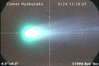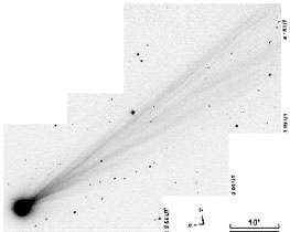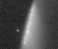 | Na teh dveh slikah so dobro vidne strukture v plinskih repih dveh novejših kometov, 122P/De Vico jeseni 1995 in C/1996 B2 Hyakutake, spomladi leta 1996. Oba kometa sta bila dovolj svetla, da so se strukture videle v teleskopih vizualno, De Vico je dosegel +4.8 magnitudo, rep pa celih 8 stopinj (fotografsko, vizualno do 4 stopinje), Hyakutake pa celo -0.2 magnitudo, rep pa se je razprostiral čez 70 stopinj nočnega neba, struktura pa je bila jasno vidna v navadnem lovskem daljnogledu. | |