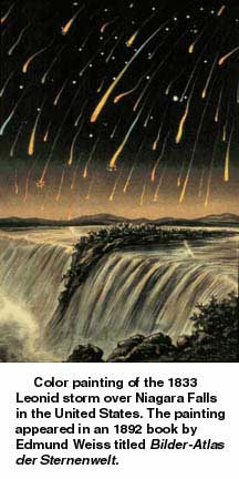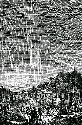 "On the night of November 12-13, 1833, a tempest of falling stars broke over the Earth... The sky was scored in every direction with shining tracks and illuminated with majestic fireballs. At Boston, the frequency of meteors was estimated to be about half that of flakes of snow in an average snowstorm. Their numbers... were quite beyond counting; but as it waned, a reckoning was attempted, from which it was computed, on the basis of that much-diminished rate, that 240,000 must have been visible during the nine hours they continued to fall." - Agnes Clerke's, Victorian Astronomy Writer